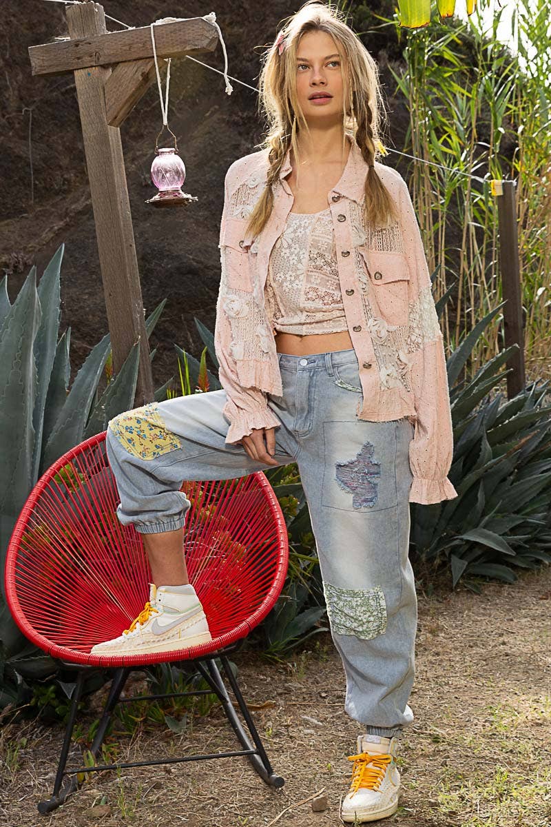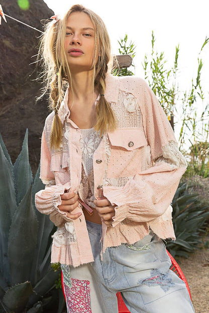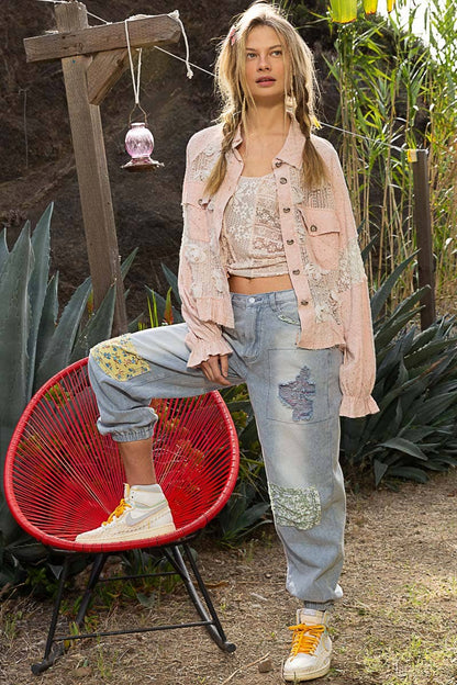 Designed in balloon sleeve regular fit jacket top in textured woven with out seam, lace fabric patch, shirring and elastic band wrist, metal button down, front pockets, raw edge detailing, vintage washing, solid colour.