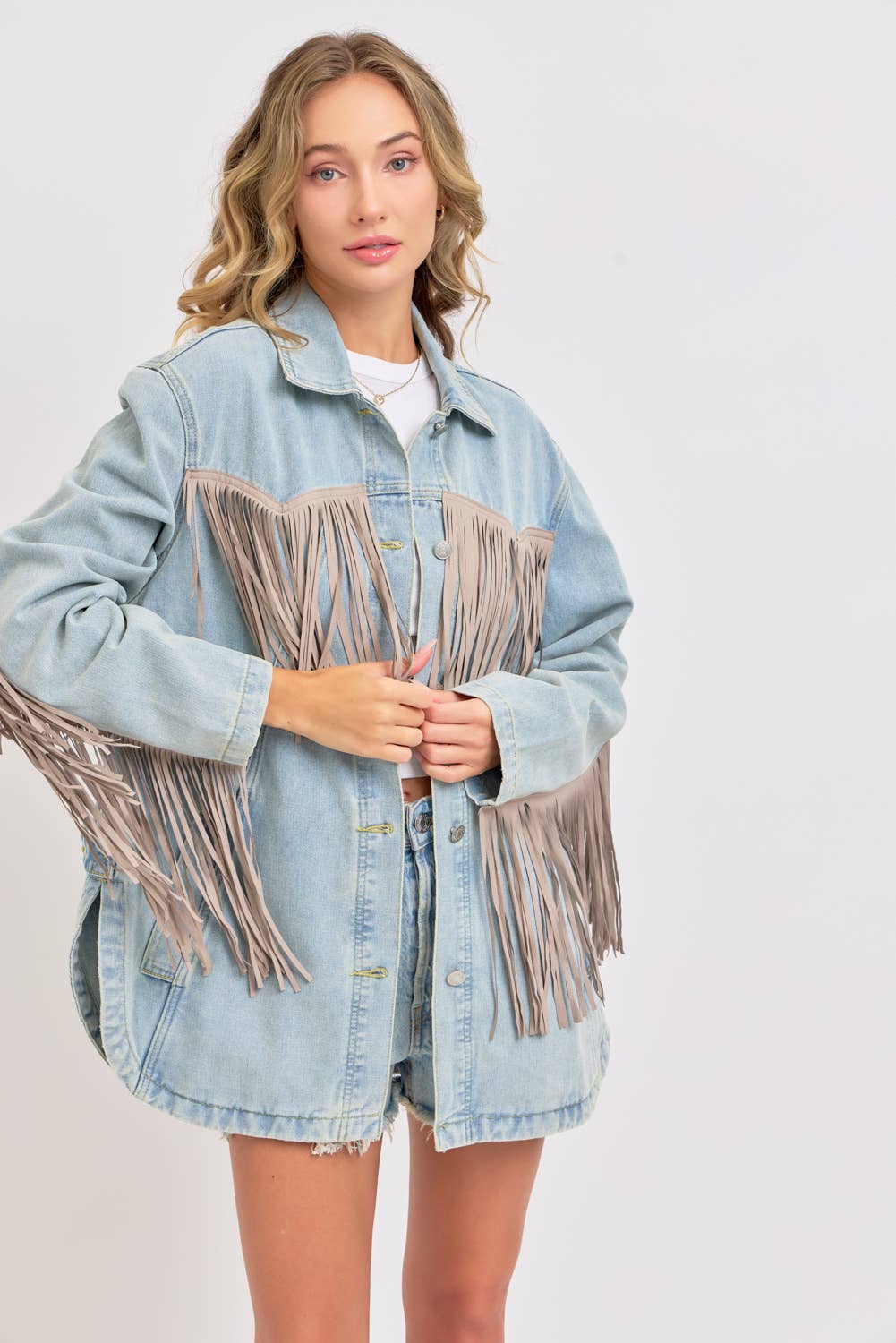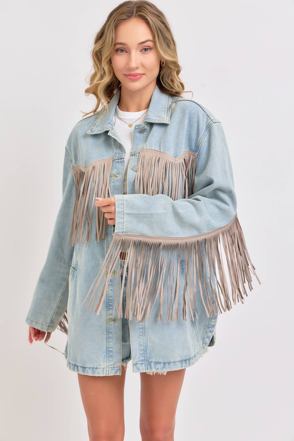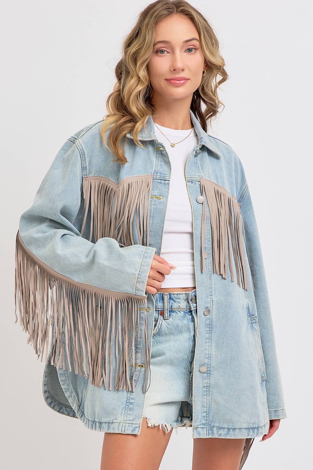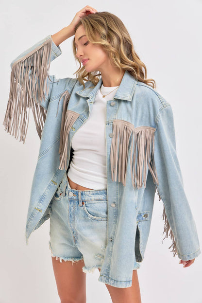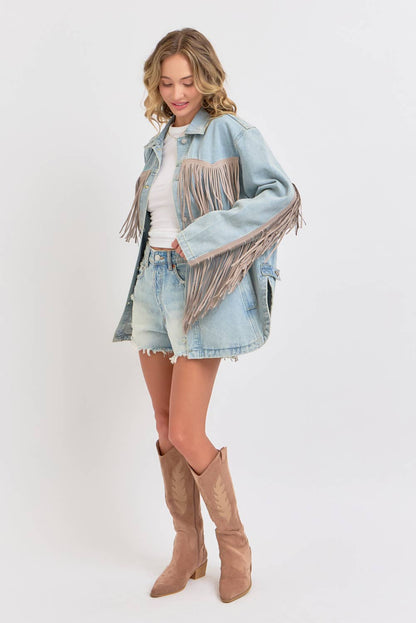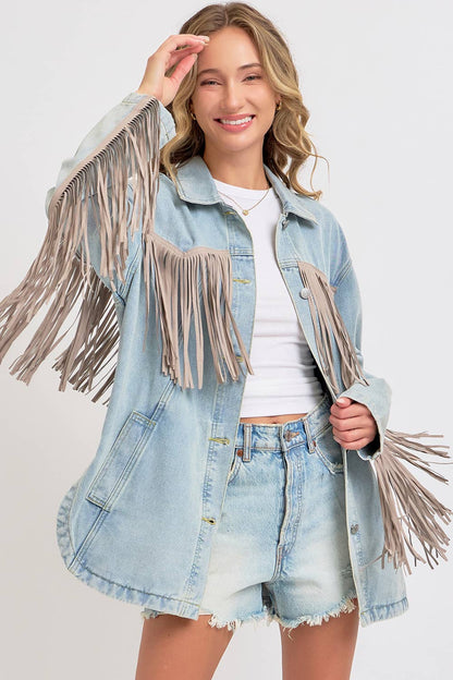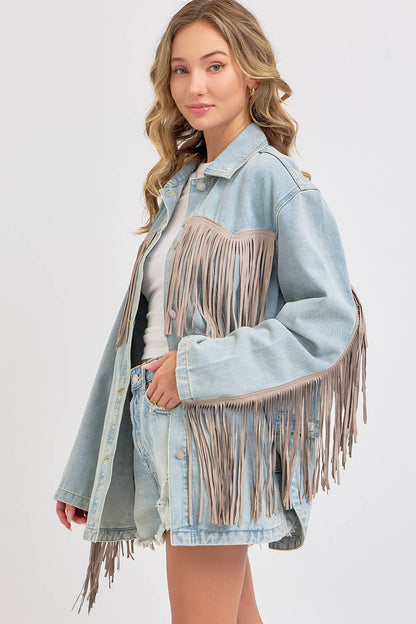 THIS VINTAGE-INSPIRED THIS DENIM JACKET IS FEATURED IN AN OVERSIZED, SLOUCHY FIT WITH EXAGGERATED LONG FRINGE DETAILING THROUGHOUT JACKET. CLASSIC COLLAR, BUTTON FRONT CLOSURE, SIDE POCKETS WASHED DENIM FABRICATION ROUNDED BOTTOM HEM, SIDE SLITS AT BOTTOM.