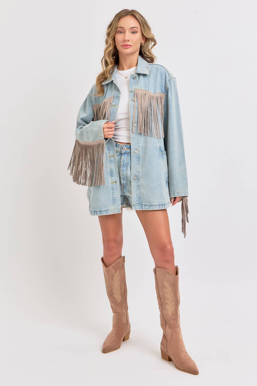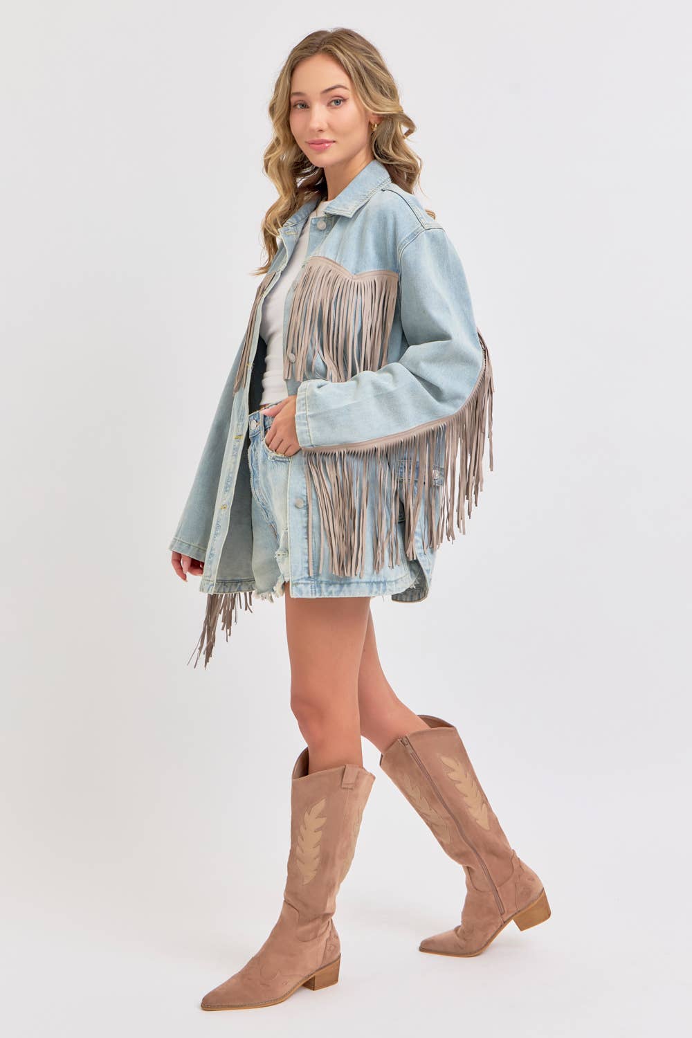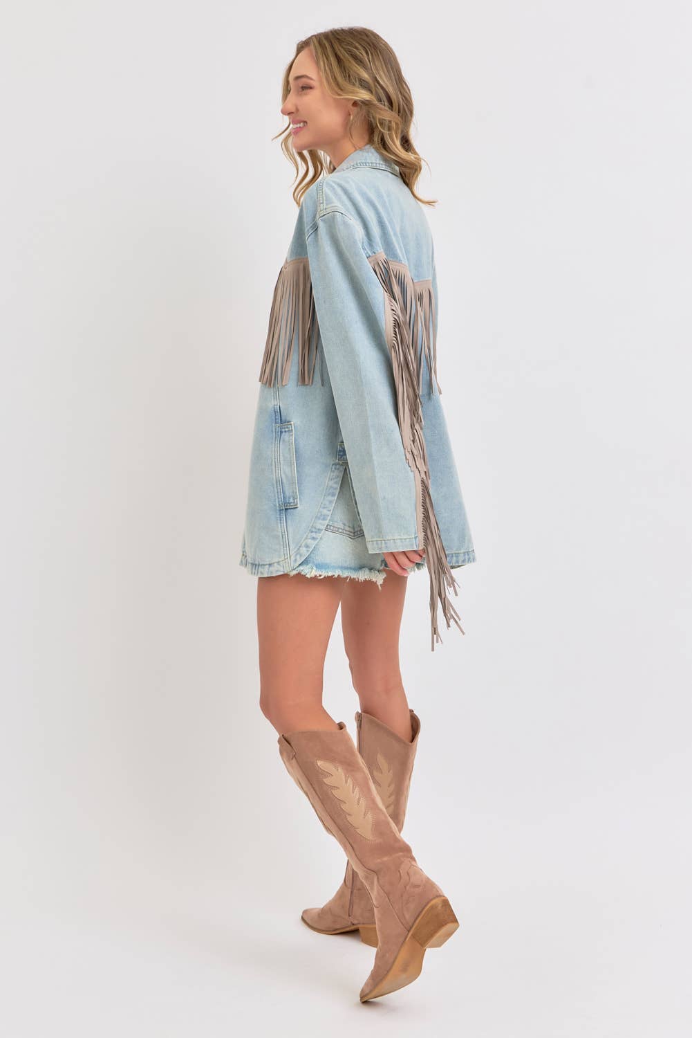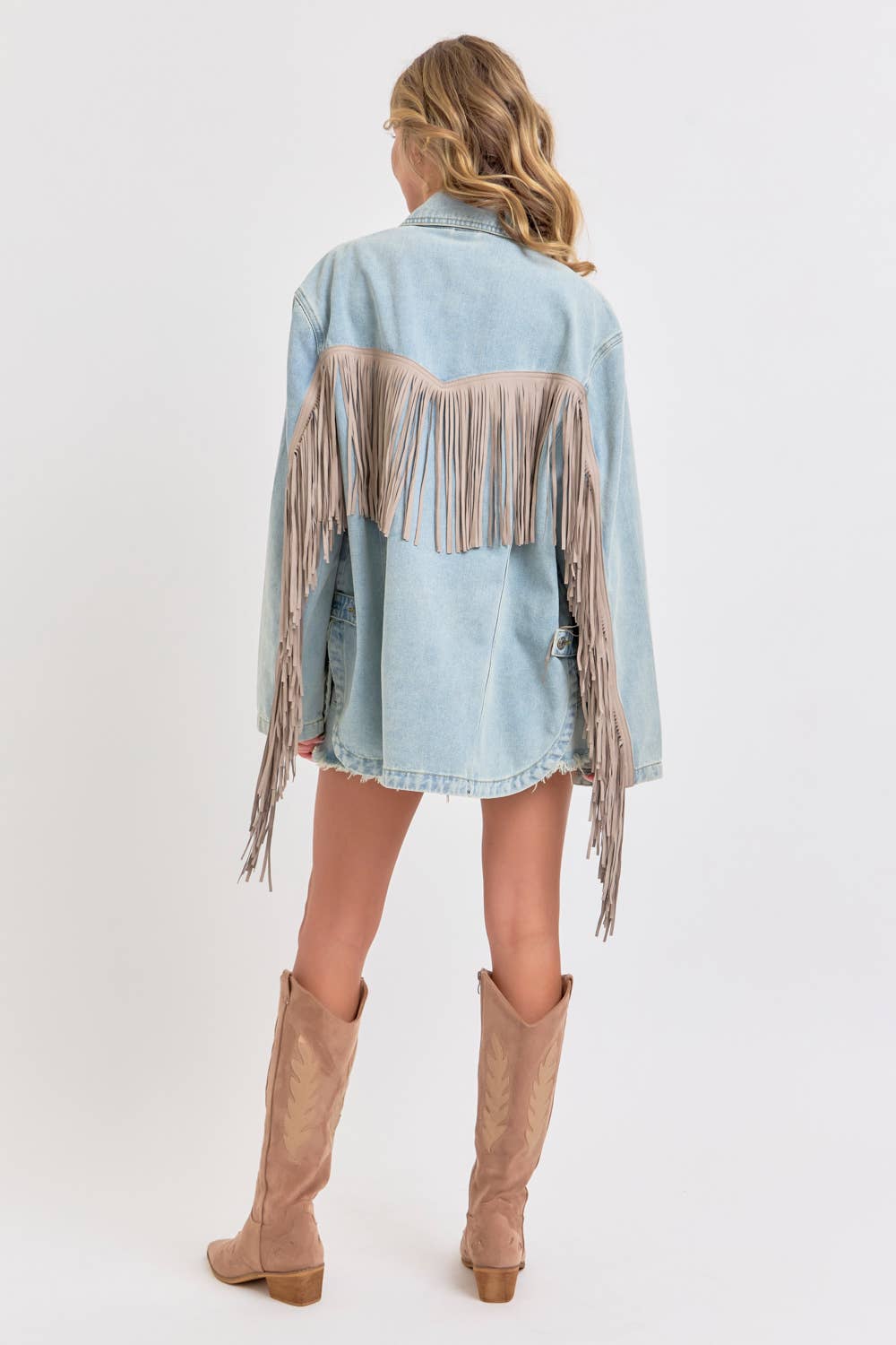 *DETAIL* -OVERSIZED BOXY FIT -DENIM JACKET -COWBOY WESTERN INSPIRED SILHOUETTE -EXAGGERATED LONG FRING DETAILING -BUTTON CLOSURE -SIDE POCKET DETAIL -ROUNDED BOTTOM HEMLINE