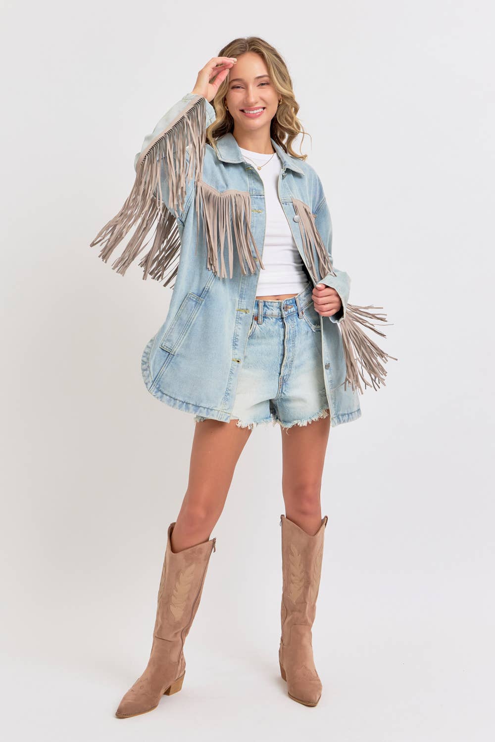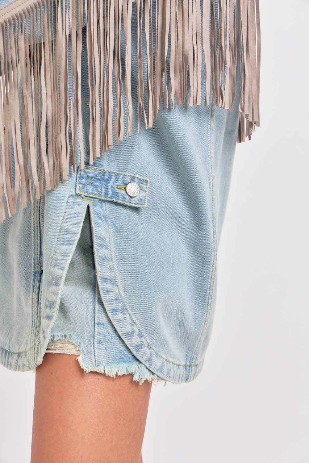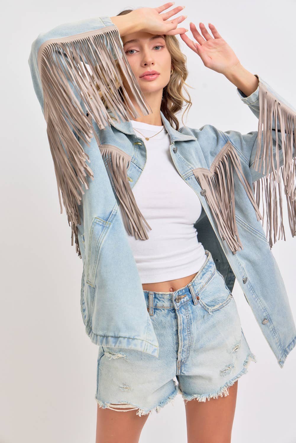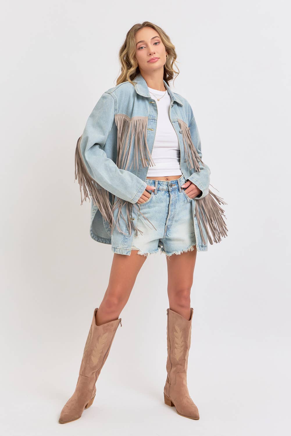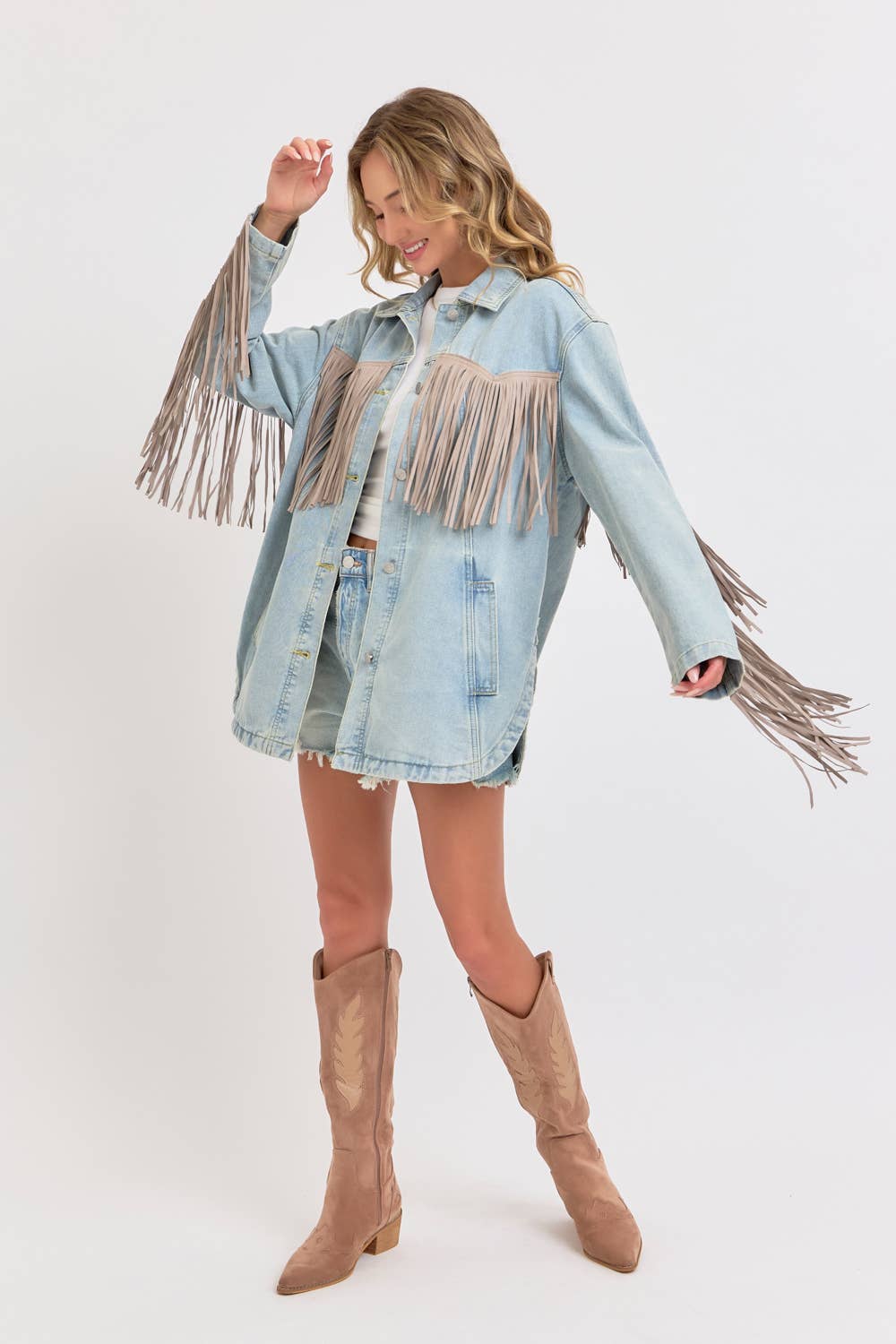 *DETAIL* -OVERSIZED BOXY FIT -DENIM JACKET -COWBOY WESTERN INSPIRED SILHOUETTE -EXAGGERATED LONG FRING DETAILING -BUTTON CLOSURE -SIDE POCKET DETAIL -ROUNDED BOTTOM HEMLINE