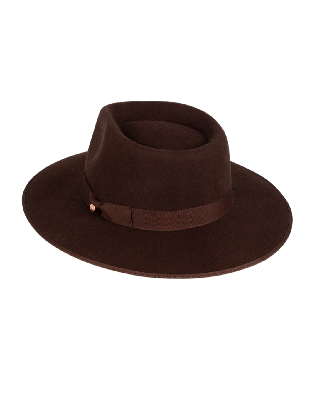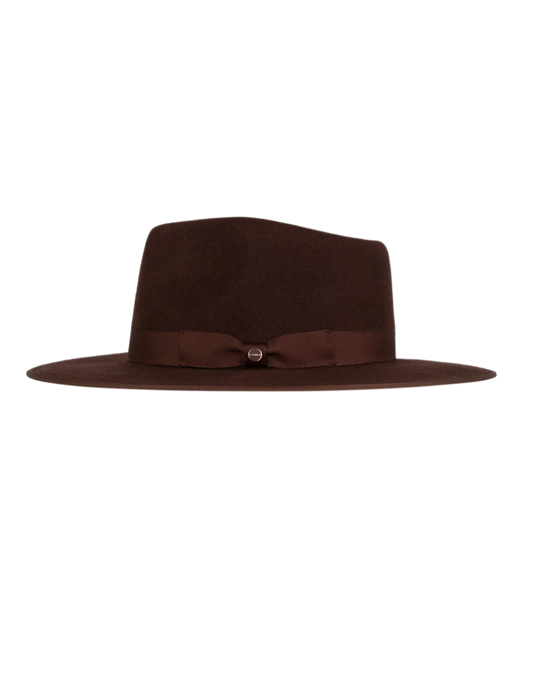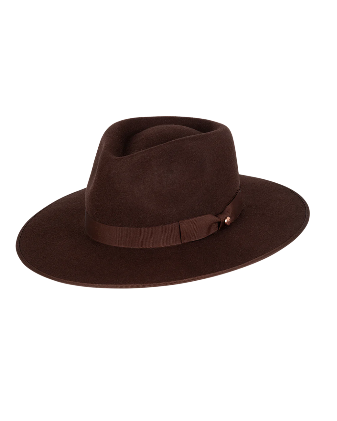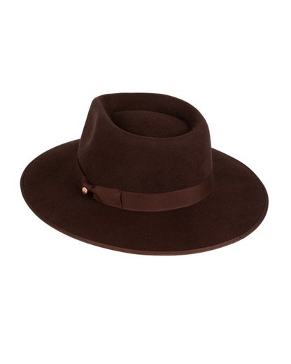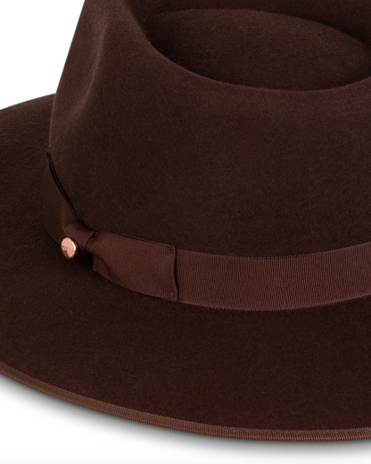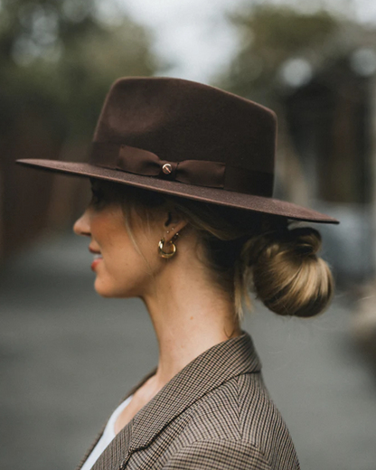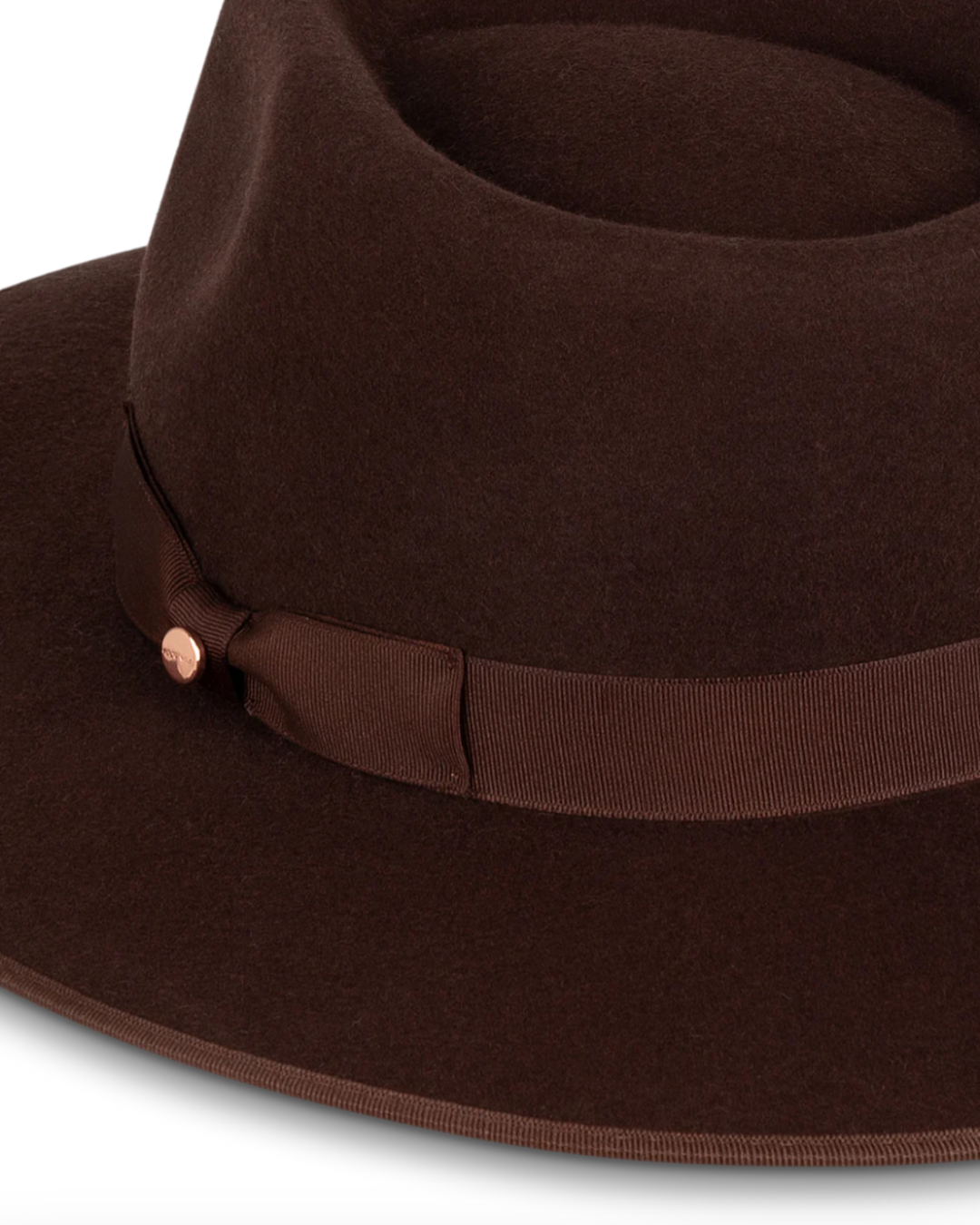 The Womens Mid Brim Fedora - Tara is the epitome of elegance. Made from premium wool, this fedora features a grosgrain ribbon crown band and a sleek metal trim logo. Perfect for adding a touch of sophistication to any outfit.